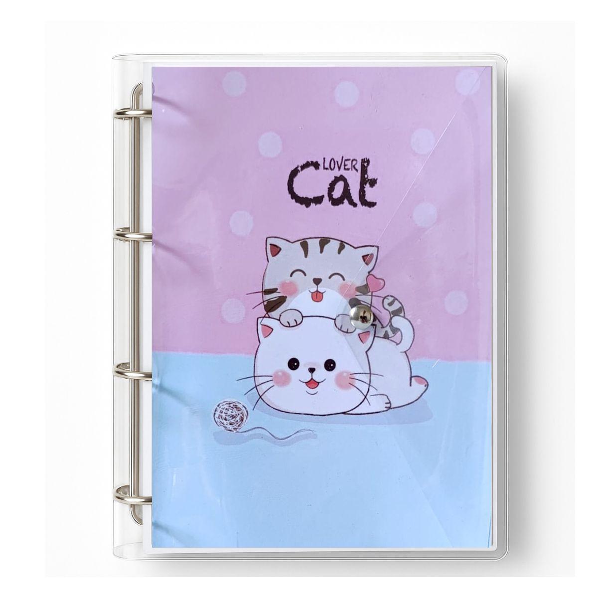 Caderno Fichário Argolado Pasta Organizadora 4 Argolas Cat Lover Transparente Fechamento com Botão