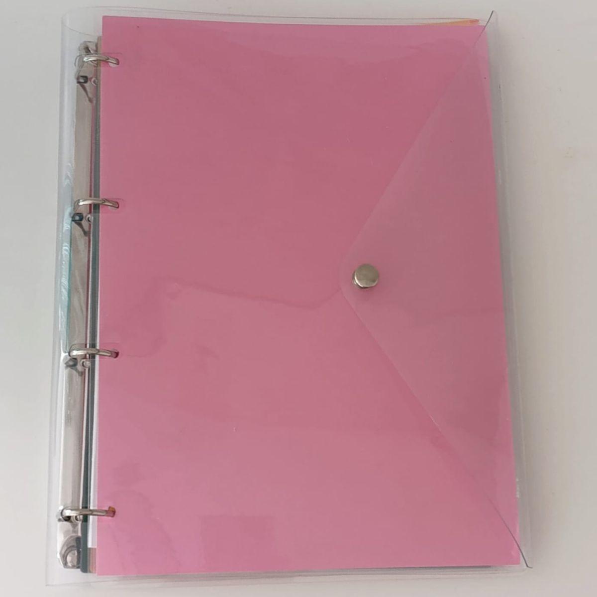 Caderno Fichário Argolado Pasta Organizadora 4 Argolas Rosa Transparente Fechamento com Botão