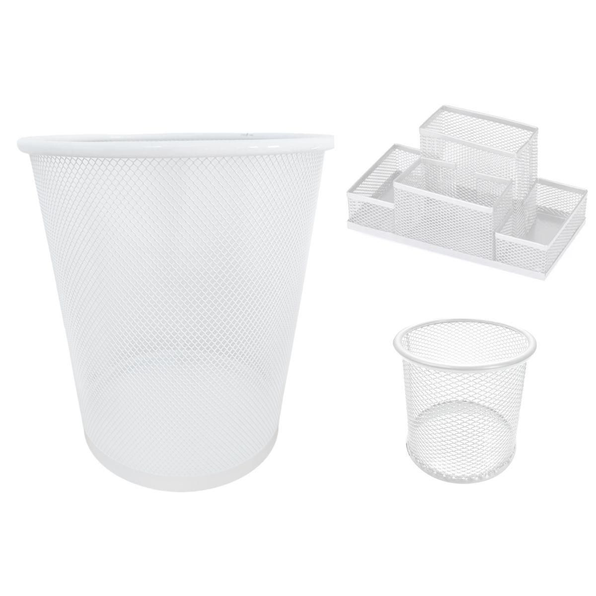 Lixeira de Escritório, Porta Caneta 4 Divisórias e 1 Organizador de Mesa Redondo Aramado Branco Gv Office